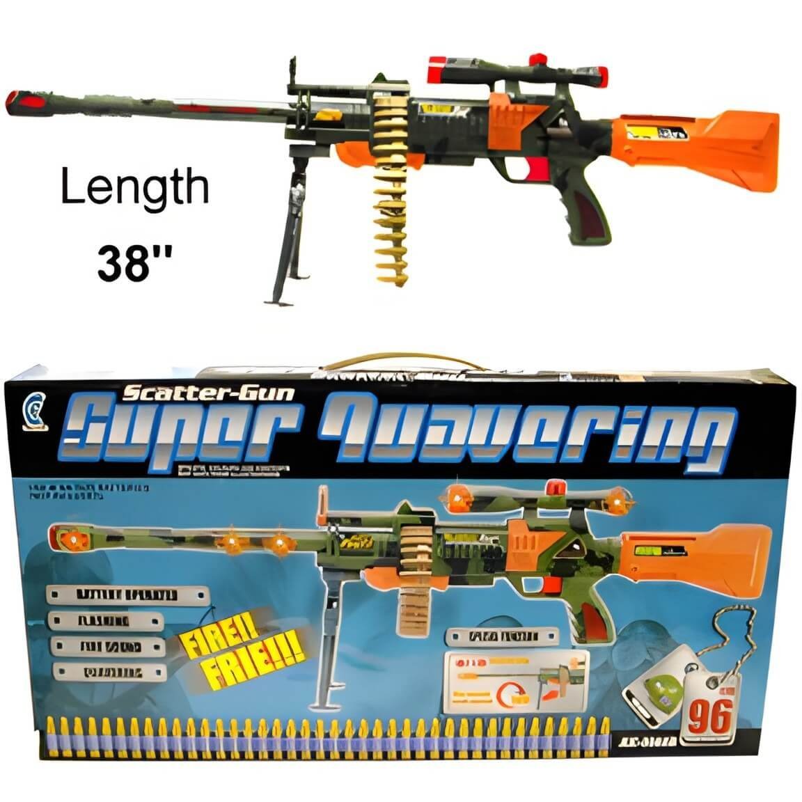 A battery operated machine gun with firing sound, moving barrel with quivering action, flashing light, a rotating ammo belt & a tripod. Uses 4 AA batteries (not included). Printed box.