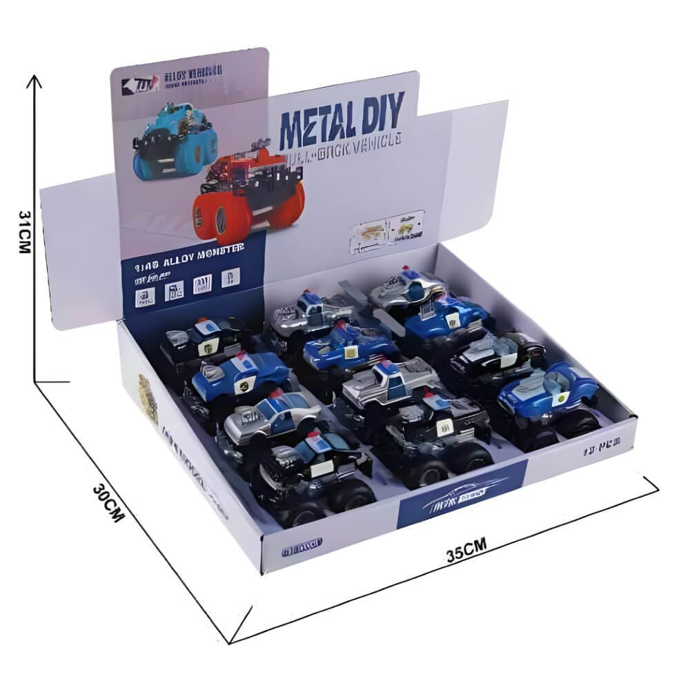 This 4″ die-cast police car toy features metal parts, bold colors, oversized wheels, and pull-back action for exciting play.