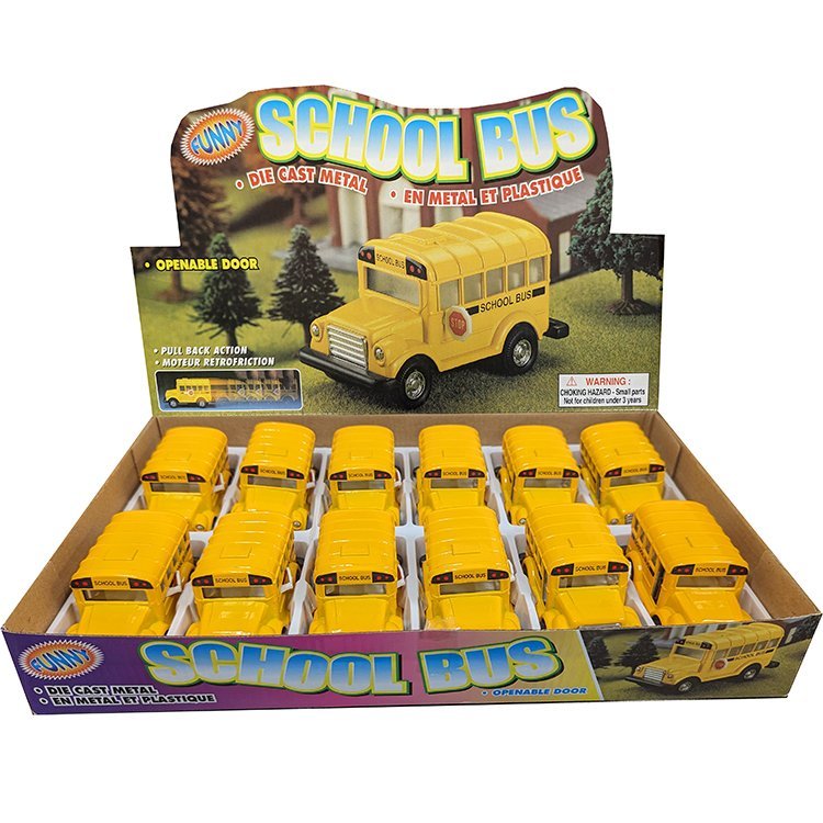 This 18 passengers mini school bus measures 4″ x 2″. Flip open door & stop sign. Pull back action. 12 pcs/display box.