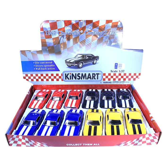 1:37 scale; pull back & go action, openable doors; 4 assorted colors: red, yellow, blue & black. 12 pcs/display box.