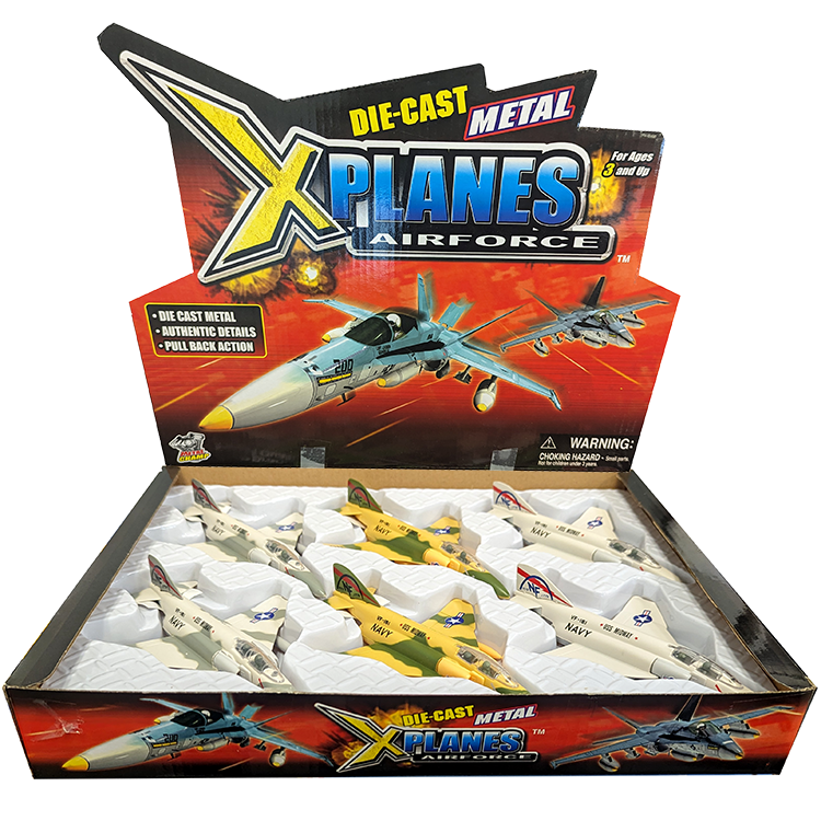 Soar through the skies in aerial combat with these metal die cast fighter planes! Pull back & go action. 3 assorted colors. 6 pcs/display box.