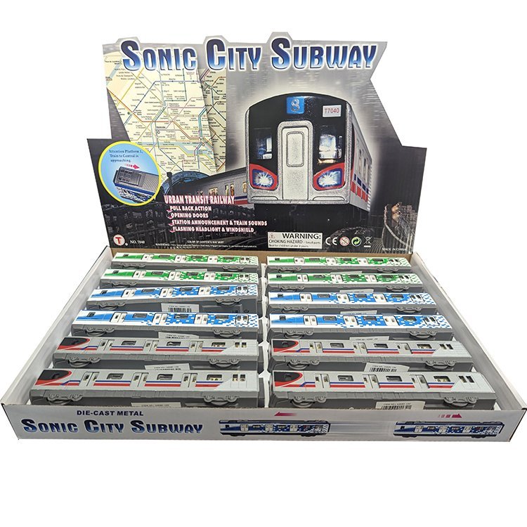 Pull back & go urban transit subway train with 4 wheels. Opening doors. Train sounds & station announcement: “Attention Platform 1, train to Central is approaching”. 4 asst. colors. 12 pcs/display box