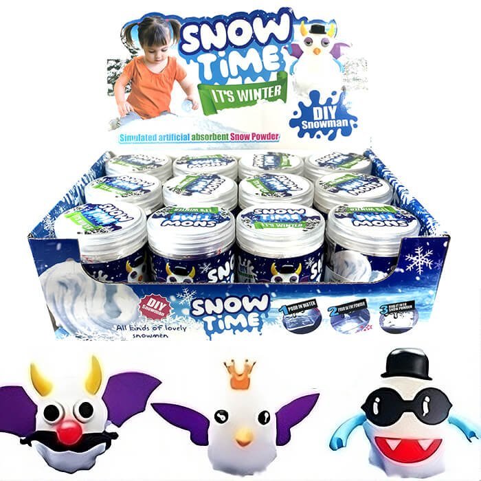 Shape the snow & attach the contents to make your favorite figures. This artificial absorbent snow gives a realistic feel & texture. Assorted styles. Each in a 3″ plastic container. 12 pcs/display box