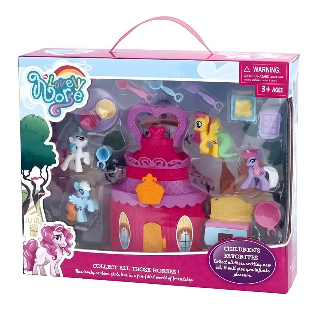 Set contains 4 2″ dressed up pony figurines & a pony castle with accessories. Window box.
