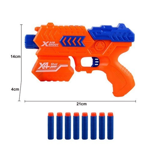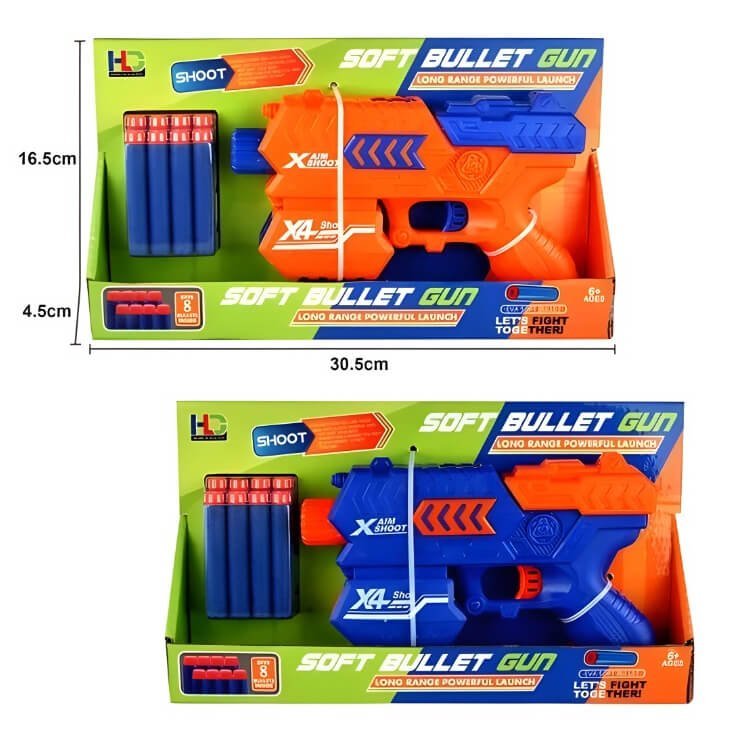 Compact and vibrant soft bullet gun with eight foam darts, designed for long-range play, easy handling, and fast action fun.