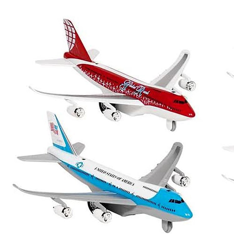 Pull back & go sonic turbo jet with onboard announcement, jet engine sound & flashing beacon lights. Replaceable batteries included. Assorted colors. 6 pcs/display box.