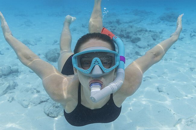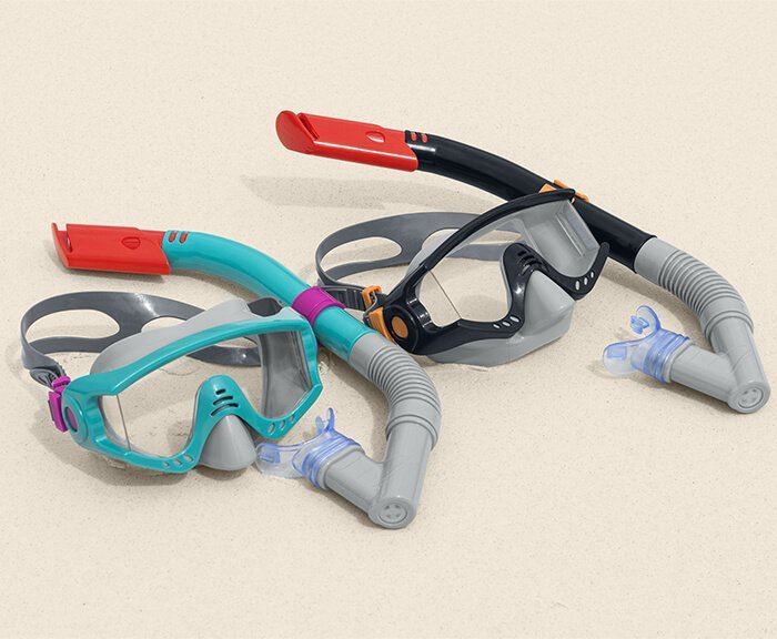 Impact-resistant polycarbonate lens w/UV coating; Adjustable head strap; splash guard prevents water from entering snorkel; comfort-fit snorkel mouthpiece; non latex material. Age 14+. Clam shell.